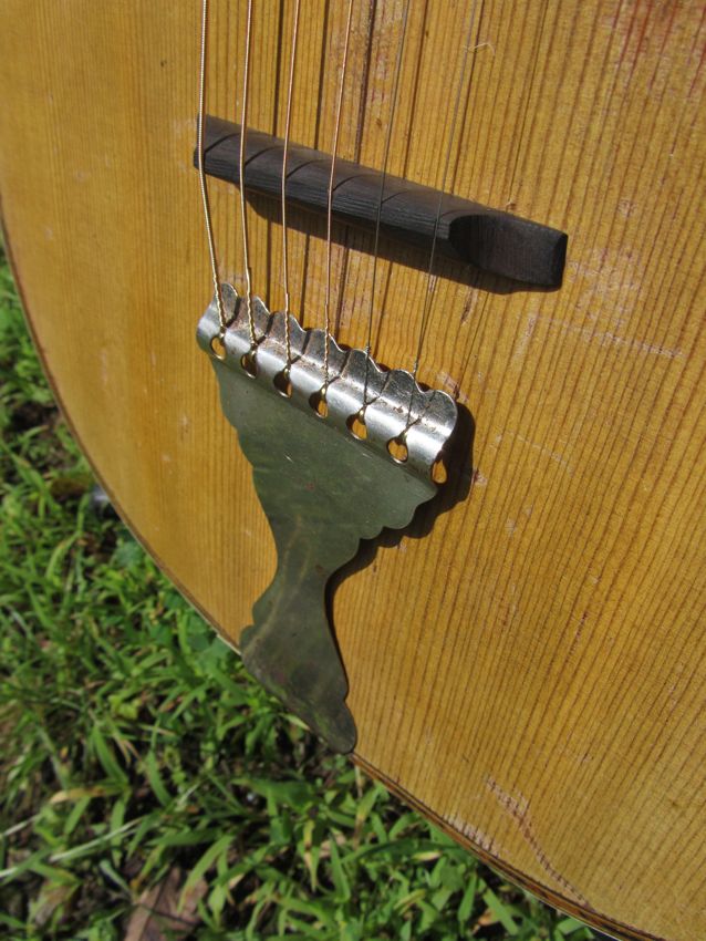 I love these old "first generation" steel-string guitars with the ladder-bracing and tailpiece design. It's a very simple way to deal with the higher tension of steel strings and lends these flat-top guitars a distinctive "fiery" tone -- loud, sustained, and sort of honky like in old ragtime or blues recordings. While this style of build doesn't lend itself to a dreadnought's big bass or an archtop's severe cut and zing, these guitars sort of sound similar to gypsy-jazz Selmer instruments, though with a very American twist -- they make excellent fingerpickers with plenty of volume and plunky, precise bass.