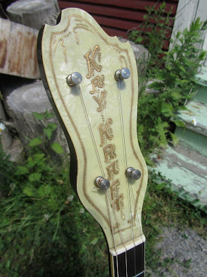 Update Oct 2012: This banjo now has a synthetic (Remo frosted-top) head installed, but comes with its original skin head included in the case. Here's what that new head looks like on it: