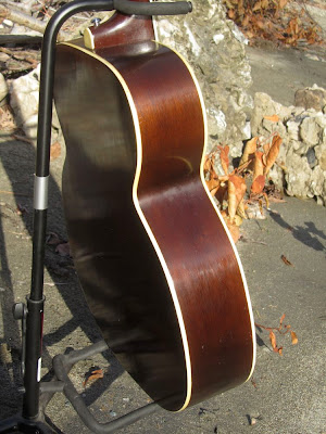 This one is a "K-22" model (so says its doubtful interior stamp) and has a solid (4 piece) spruce top with ladder bracing over laminate mahogany back and sides. The neck is a one-piece, baseball-bat profile, mahogany bit that has subtle curly figure here and there.