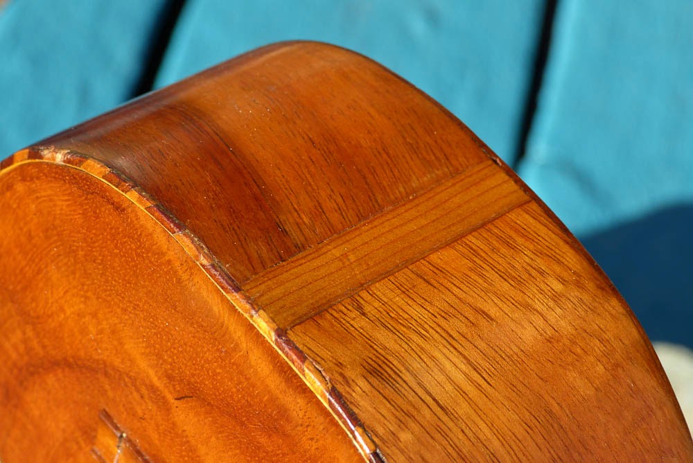 Everything on the uke is original, including these wood violin-style pegs. The owner and I might do some trading or purchasing (or not) involving this uke, so these might be swapped out with modern friction pegs (or not). I think that would be perhaps a small shame, as these pegs work just fine now that I've applied a bit of peg dope to get them turning smoothly.