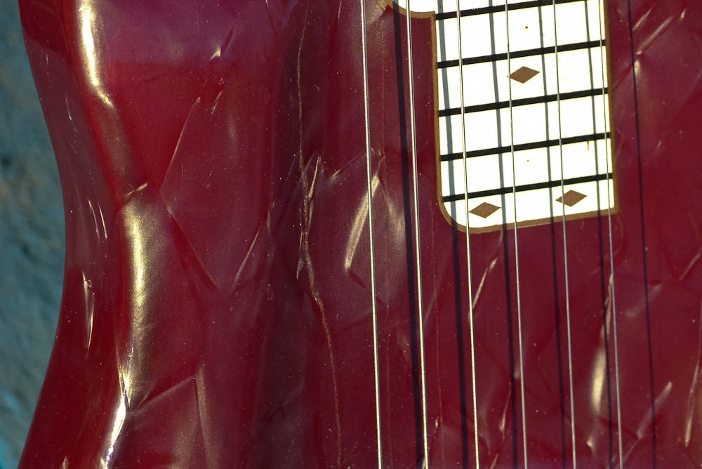 From a product design perspective, this little Magnatone lap steel is very cool. It's got an integral "hand rest" below the pearloid, the pickup (single coil) is covered under pearloid and that metal cover, and the whole thing is super lightweight and has a sort of early-Fender kind of tone to it. It's clear-toned and California-ish sunny.