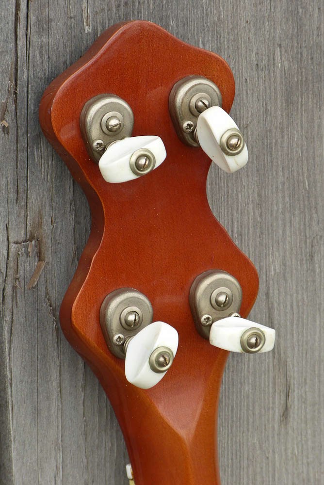 Despite being a 60s banjo (the owner bought it in the UK in the 60s) the tuners are American-made units of the type seen on late-20s banjos... they're 2:1 ratio and turn the shafts backwards when tuned up... so you just sort of have to accept that your strings are going to around the shaft the wrong way unless you want to wrap your head around tuning up backwards with your hand...!