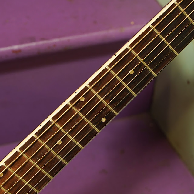 Condition notes: truss rod cover has a split in it... the saddle is a replacement... and the back has 3 medium-length hairline cracks that are repaired. Otherwise it's in good order save the usual finish-checking/weather-checking throughout and light/average usewear/scratching. The fretboard extension does dip down into the top a little bit away from the rest of the board, though, as these instruments tend to "sink in" around the soundhole and "belly-up" under the bridge as they age. It's not dramatic but it's there and... it's there in all of these that I've worked on, so it's nothing to worry about.