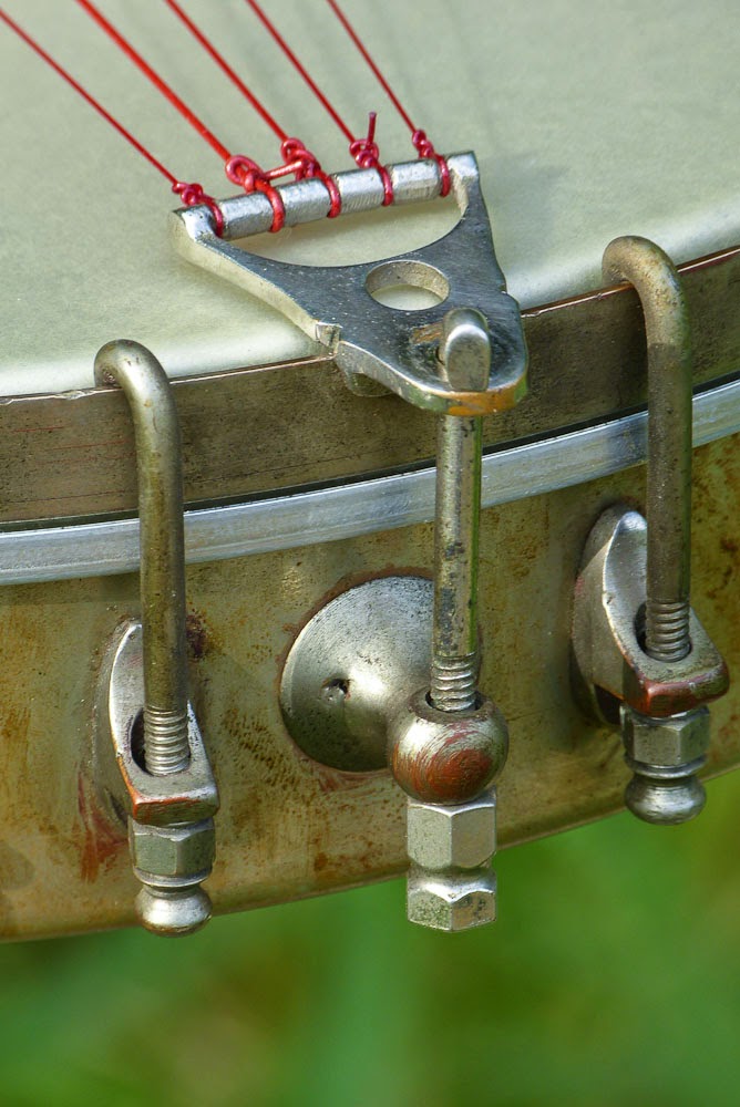 I'm almost certain this was made for Wurlitzer by Buckbee in New York, but I could be wrong. It's just very much after a Buckbee fashion with a double-edged spunover rim (its nickel-plated brass "sleeve" is curled-over on either side which creates an integral "tonering" on the top edge) and "figure 8" headstock shape. The neck carve, dimensions, and original fretboard material also all point to Buckbee to my eyes. The main departure, however, is in the fantastic neck brace mechanism which is my favorite from the time and more often seen on British banjos than American makes.