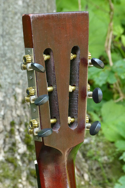 Here's a sweetie: a real clean "decalcomania" Stella from the 20s! This is a customer's instrument that was in for work and it sure scratches that country-blues itch. Work included a neck reset, fret level/dress, a new nut, seam repairs, and general setup.