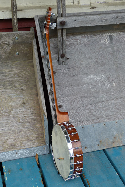 Features include a fast Gibson-y profile neck (thin and C-shaped), longer 26 5/8" scale length, mahogany neck with aluminum non-adjustable truss rod, ebony board, 11-ply maple laminate rim and has narra-wood veneer (which is awfully pretty -- sort of like koa in the curly grain). The rim is a standard 11" in diameter, sports two coordinator rods for full neck/pot adjustment, and the build is sturdy all-around. The neck itself is dead-straight even with its relatively quick profile -- something I say thanks to for that nice big old block of aluminum installed under the board. This has a standard brass "hoop style" tonering which gives it a classic 20s/30s voice when combined with the long scale.