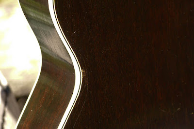The finish has UVed to a very dark brown that's almost black from a few feet away. It's original, though, and I'm sure it hasn't been oversprayed as it looks exactly right for an old Gib -- though there's evidence in the soundhole that someone in the spray room didn't shove enough newspaper in the hole when they were coating it.