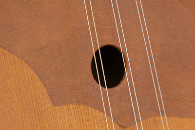 I changed the stringing from normal balalaika tuning (E-E-A is what's often used on the 3-string variety and G-B-D in the same range as open-G guitar's top strings is common on this 6-string variety) to an open G modal chord (G-D-G) using mandolin strings (24w-14-10) which can be retuned to the G-B-D tuning by jumping up the plain gauges to 17-13. It plays like a mountain dulcimer in this tuning. I'd originally strung this with octaves in a bizarre tuning but I find the instrument likes this range and style much better (as it's closer to traditional pitch).