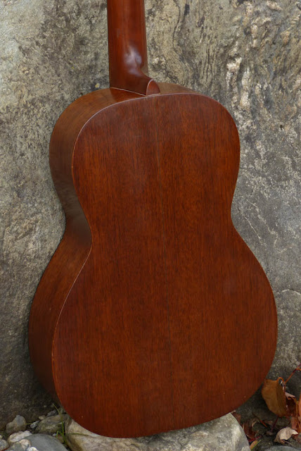 This nice old 12-fret "0" has more in common with a 1930 Martin 0-18 than it does with any of its nearest contemporaries. It's built light, light, light, light and as such shares the same rewards as that old 0-18 as well as the downfalls. As a fingerpicker using the lightest-gauge steel strings it sounds blissful, warm, sweet, and full. As a flatpicker -- because of those necessarily-light gauges -- it still sounds swell but loses a lot of the straight-up fullness you hear fingerpicked.