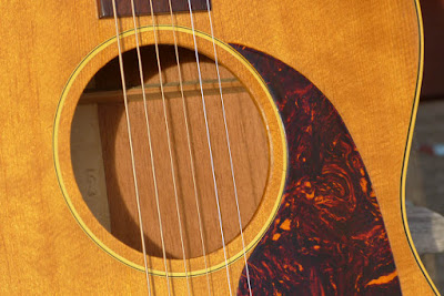 It's also very, very clean for its age and aside from my new bone saddle and new tuner buttons, is entirely original. There's weather-check to the finish all over but only one (1/4" and repaired) hairline crack at the soundhole edge. The finish has also aged to that beautiful buttery-yellow color and, as you can see in the pics, the sunlight really picks out some pretty curly-looking figure in the grain of the top.