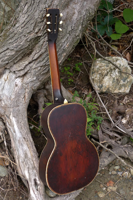 I think it's fairly obvious that this guitar has had a rough life, though for serious injury it only has a couple hairline back cracks, that stabilized "2nd soundhole," and missing purfling/binding to really show for it. I didn't even need to do a neck set on it to re-use the original bridge at almost full height.