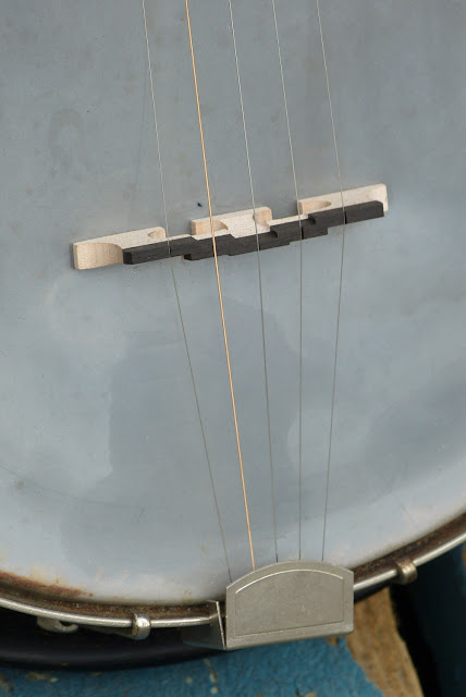 A consignor dropped this off in a pile of other gems and oddities, and this is the one I got to first. I've worked on a lot of old Kay banjos and I'm beginning to feel deja vu with them, now. This one got the usual work which included a fret level/dress, "modernization" of the coordinator rod setup (see here for my guide to this), a new compensated 5/8" bridge, and a good setup with 9s. It has a straight neck, plays beautifully (setup for "picking" at 1/16" at the 12th fret), and sounds worthy.