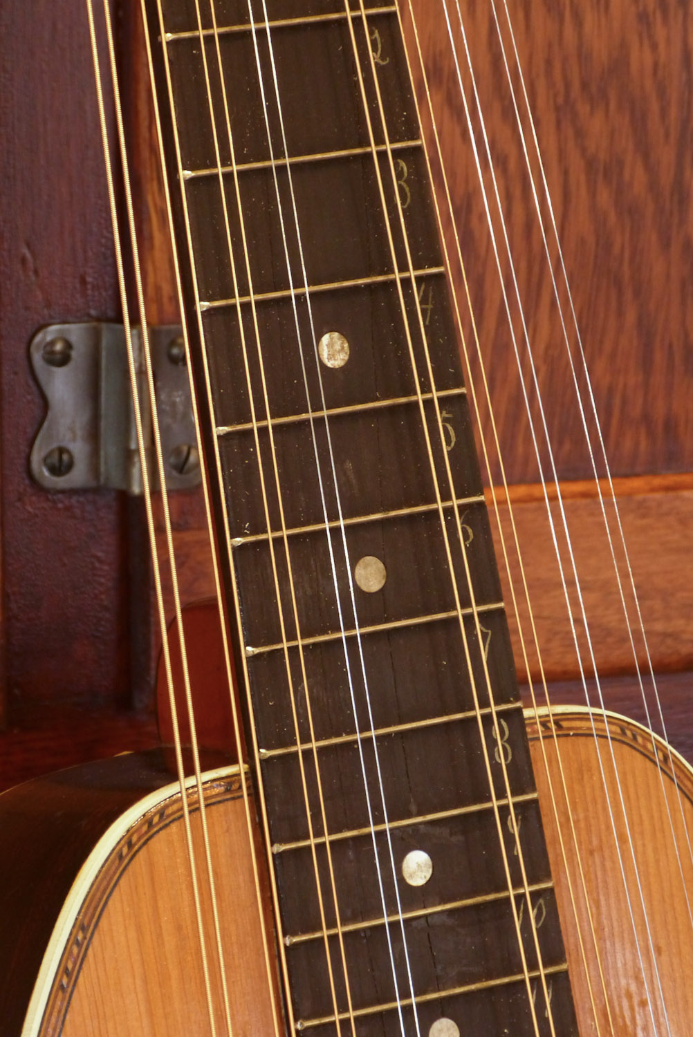 My repairs included regluing the headstock seams at the top (where they'd come loose), a new rosewood nut (to replace an original which also had "wings" but was damaged and shorter), modification of the bridge, replacement of a big section of binding on the top, various crack and seam repairs to the sides and back, and whatever other minor stuff needed doing.