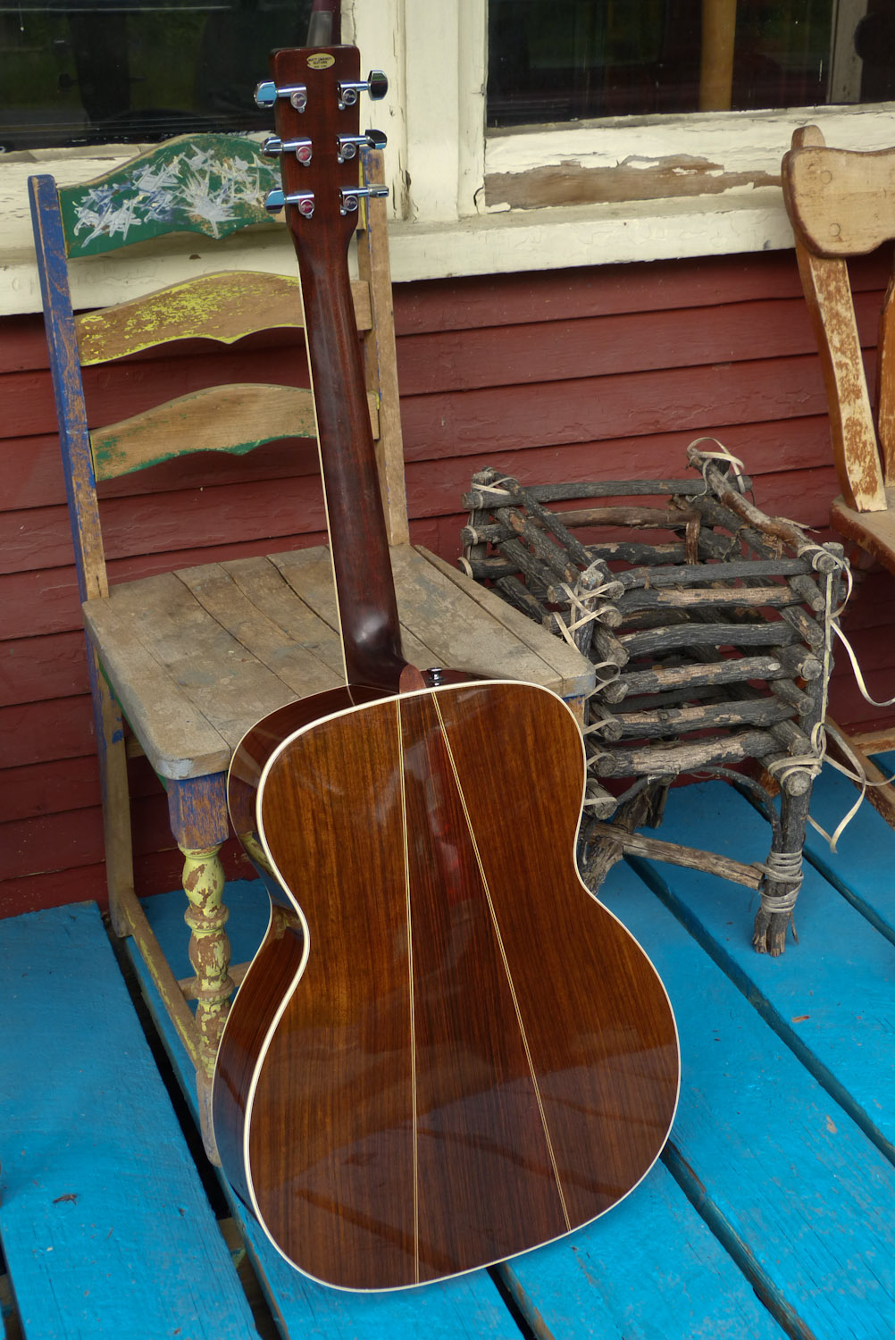 Strangely enough, in our area of Vermont there's an outsized number of M-sized (0000, 16" on the lower bout) Martins that come in for adjustment. This one was sold by Umanov's shop sometime in the past and dates to 1994. It must've had some "aging toner" on the top as it has a full, buttery-orange, "vintage" look to the spruce. Its owner came by to have some binding reglued (3 minutes' work, thankfully), but I also gave it a quick setup as the action was getting fairly brutal.