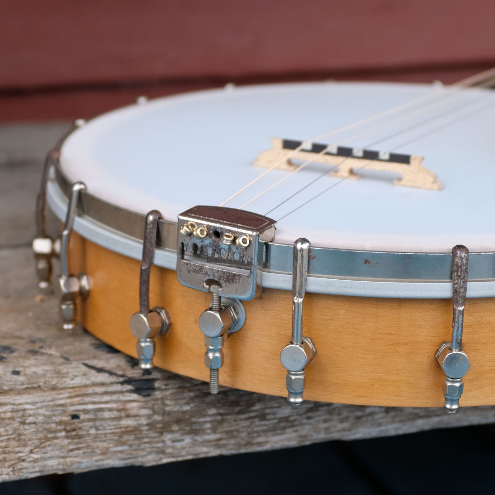 It's mostly original, though of course the frosted-top Remo head, tuners, and bridge are new. The tailpiece and rim hardware is original. It has a 1 1/8" nut width and a slim, comfortable, soft-V neck profile. Action is spot-on at 1/16" at the 12th fret and it has a straight neck. The nut is slotted to allow baritone-uke nylon strings, if desired, and I've heard this strung-up DGBE "Chicago" with steel, too, and know it sounds nice that way as well.