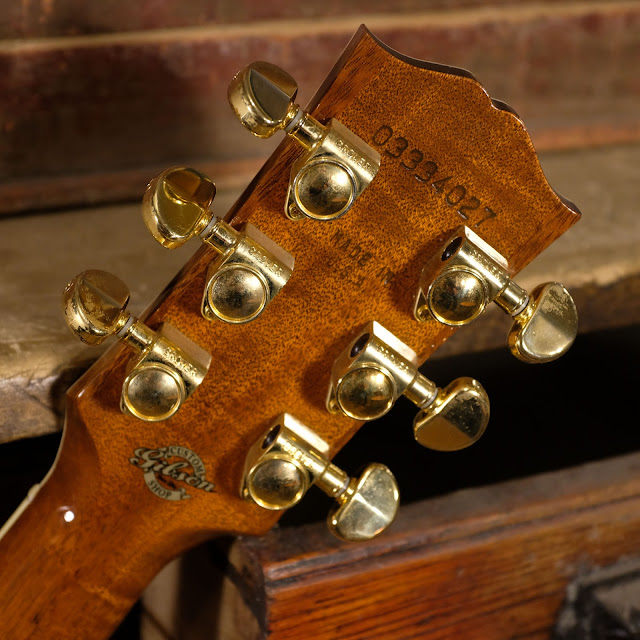 It was built by Flatiron Gibson Montana and is similar to a same-timeframe J-45 "vine" model, save that the board and bridge are ebony, the tuners are plainer, and the "vine" inlay in the board is replaced with repeating, semi-Nick-Lucas-triangle shapes.