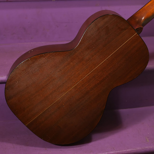 The top is solid spruce while the back and sides are solid mahogany. The neck is Spanish cedar and the original bridge is ebony. It's had a rough-ish headstock break (and repair) in the past, but is otherwise fairly clean except for some finish alligatoring on the back and usual wear-and-tear marks. I'm pretty sure this was used exclusively as a Hawaiian-style guitar for many years as there's the usual wear-line from an extender nut on the fretboard and there's no endpin.