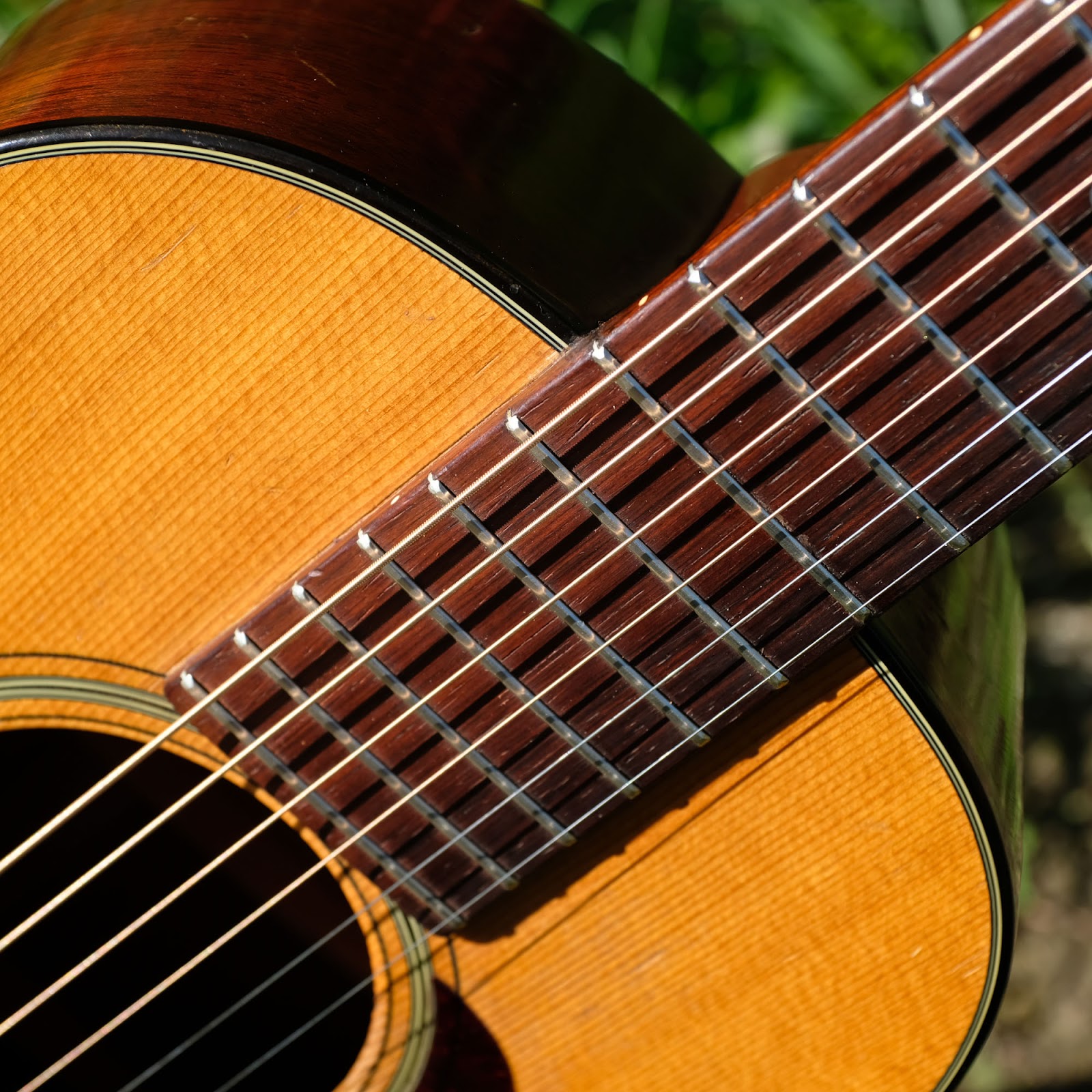 This one came in via a customer and work included a neck reset, fret level/dress, bridge removal and reglue (Martin had glued it ~1/8" too far to the rear), new bone compensated saddle, a replacement endpin, cleaning, and setup. The neck is straight, its only cracks are a set of nasty, old, repaired ones on the treble side, and it's also all-original save the endpin (as the original saddle is safely tucked into the case pocket). It plays on-the-dot.