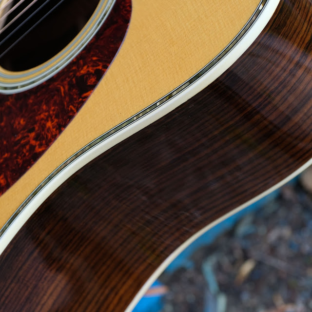This guitar has a strong bass. It's big, full, wide, and creamy-all-over. I had to really get the mic off-axis so it wouldn't drive it too much. Basically -- when someone's looking for that "big fat rosewood D sound" -- this is it. It also doesn't hurt that it looks pretty, too.