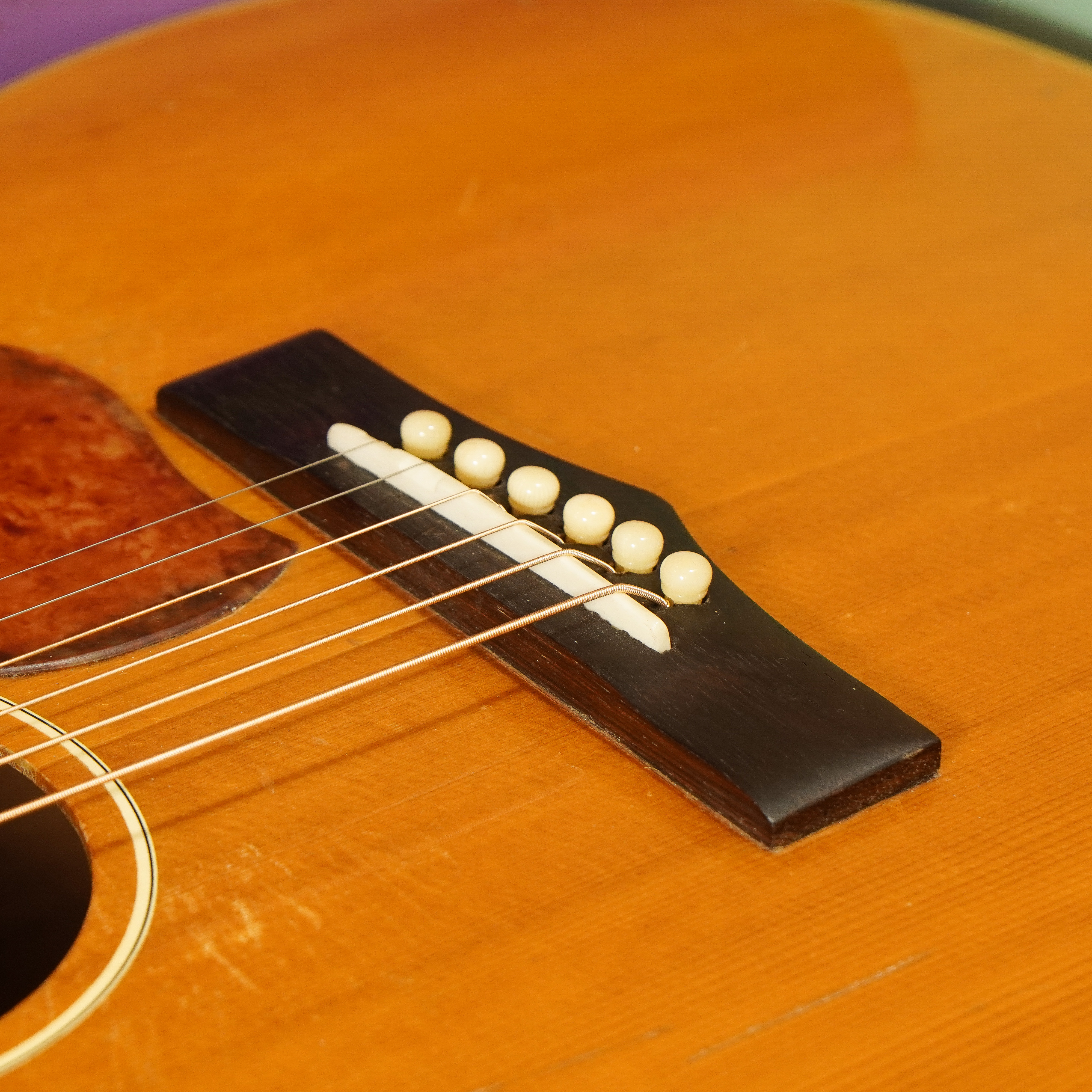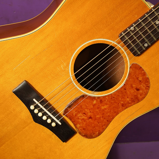 Condition notes: one repaired hairline crack to the top-lower-bout, several long, deep, with-grain scratches in the top (not cracks), and mild usewear... but overall very clean for its age. The past owner reglued the bridge and filled the holes where the 4 original bolts would've been installed in it. Someone also filled some nail-divots in the fretboard with who-knows-what! At least it's rosewood-ish in color. The neck is straight, it has remained stable in service while I've known it the past 3 years while wearing 12s, and the adjustable neck gizmo works perfectly.