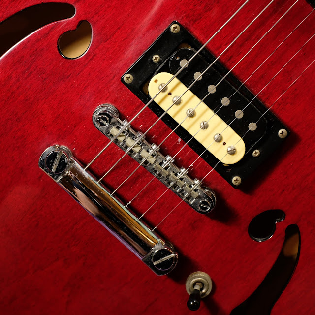 Ever since its introduction, Gibson's ES-335 has been copied over and over and over. This one is a lot like a 335, but is a little smaller in the body width and definitely doesn't have the same sort of "horns." With its Chicago-style segmented F-holes, it looks a bit like a mix between a '60s Kay Speed Demon and a '70s import 335 clone.
