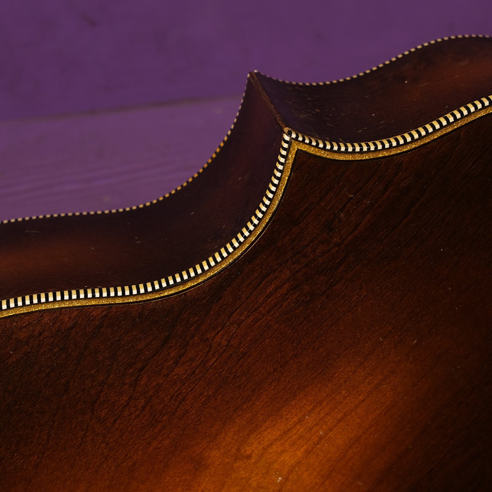 Condition notes: some wonky old repairs are evident, a broken but attractive pickguard remains, there are plenty of scratches and scuffs, the fretboard has lots of small hairline cracks in it (and some old chip-out), the fretboard extension drops away from the rest of the board a bit over the body, the twin-gold-sparkle inlay on the fretboard fades-out around the 1st/2nd frets (due to some of my board-planing, unfortunately), and it has general wear-and-tear throughout. Unoriginal bits are the tuners, frets, saddle, one small section of binding, one pearl dot in the board, and (ebony) bridge pins. The rest is original and the finish is, too.