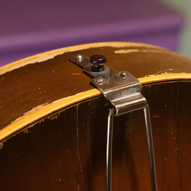 The story is the same with this guitar as with the last one -- the body is a carved-top/carved-back Gibson L-7 body that was sold to National. National then installed one of their bolt-on/angle-adjustable "Stylist" necks and finished it to taste. This one is mostly original but has a replacement bridge and pickguard -- though the pickguard is appropriate. Because it's a 1950 and not a 1951, the neck is slightly slimmer front-to-back, the inlays are a hair different, and it has the more-thin, low-profile cover at the heel area for the adjustable angle mechanism.