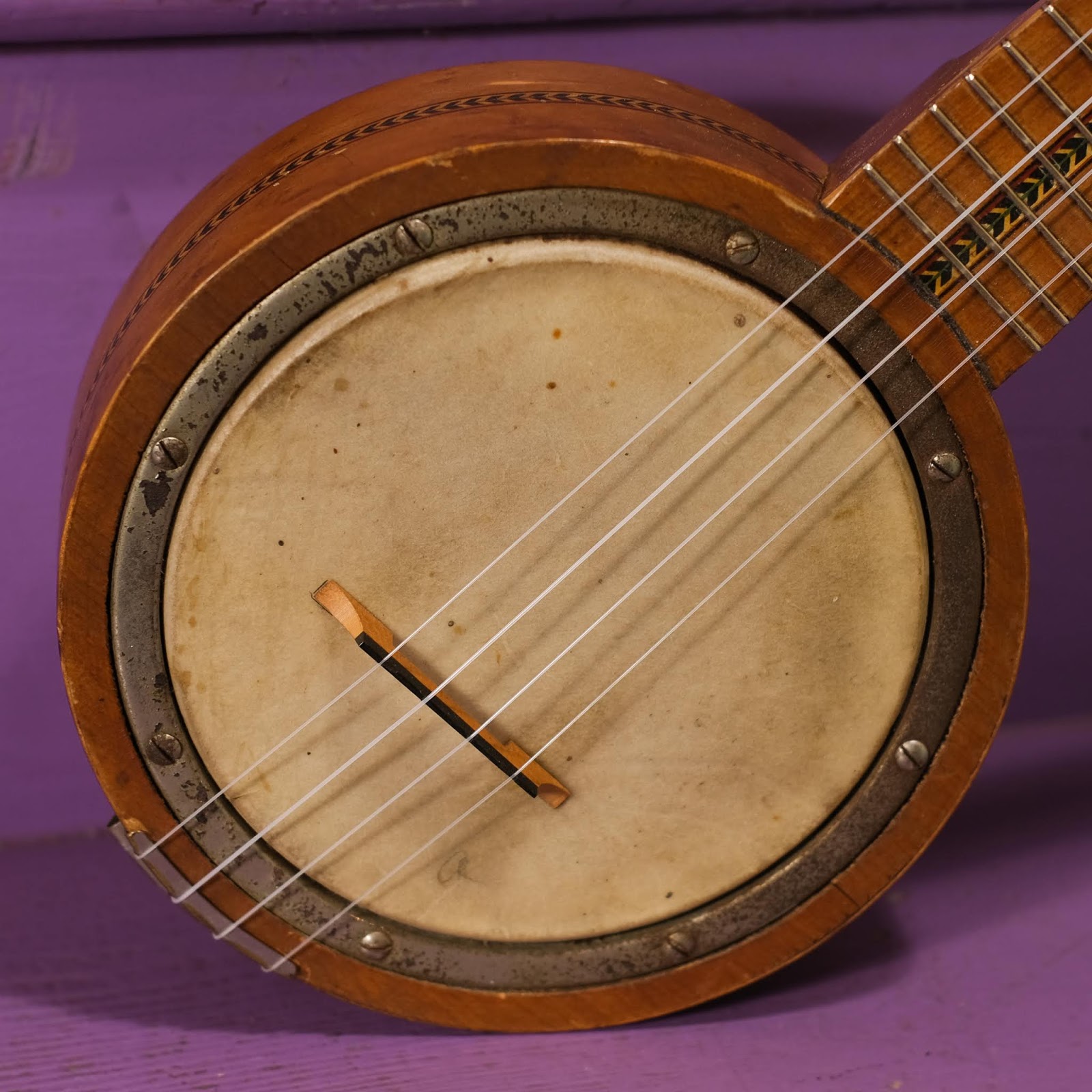 Condition notes: there's wear-and-tear throughout with lots of nicks, scratches, and dings. That's totally normal for this type of banjo-uke and I've only seen one or two I'd describe anywhere near clean. The tuners are vintage replacements and the bridge is a vintage replacement, too. There's one tiny little tear on the head near the tailpiece, but it's stable and a non-issue.
