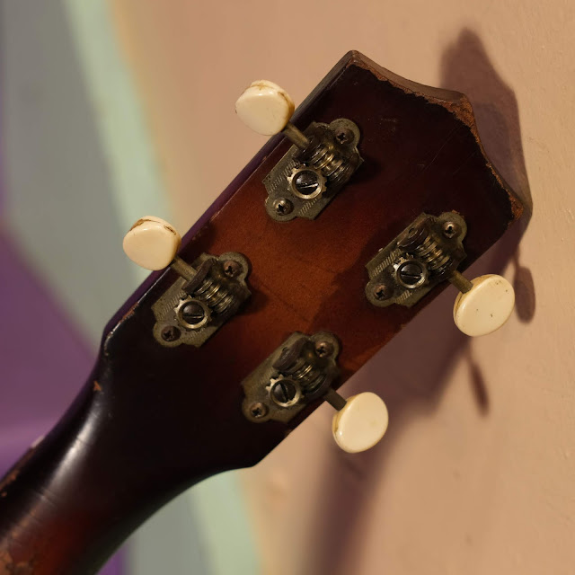 I've always wanted the chance to convert one over for use as a steel-string tenor guitar and when I saw this very-pickworn guy for sale, recently, I jumped at the chance. It needed a lot of work, but I loved the look and it was entirely worth setting it up this way. Its tone is chimey, rich, sustained, and clean -- and it records easily. It sounds particularly good for fingerpicking.