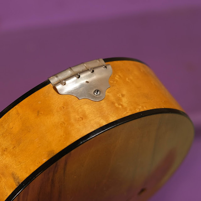 Yet one more Harmony banjolele for the collection! Not mine -- but, ya know -- digitally. This one has a cool "canoe scene" decal on the head and has both an f-holes-cut resonator on the back and binding on the top and bottom edges of the rim. So... it's a little spiffier than average.