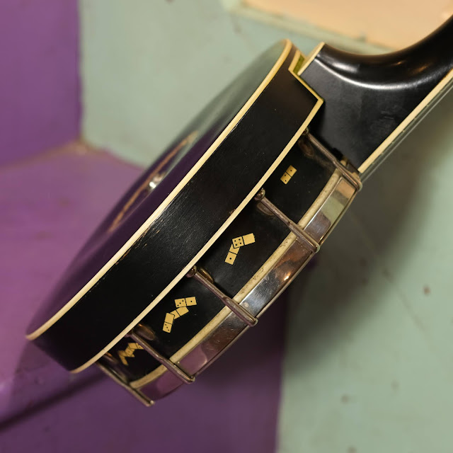 I've worked on lots of similar banjo ukes that were touched by the ambiguous JR Stewart and/or Regal-made connections, but this one's about the best, eh? The LeDomino instruments are simply cool -- not just because of the decals but also because the styling was well-thought-out. I love the way the slim celluloid binding fits around every angle on this thing... with the tuxedo-black finish giving it real pop. Folks, effort was put in to making these cool.