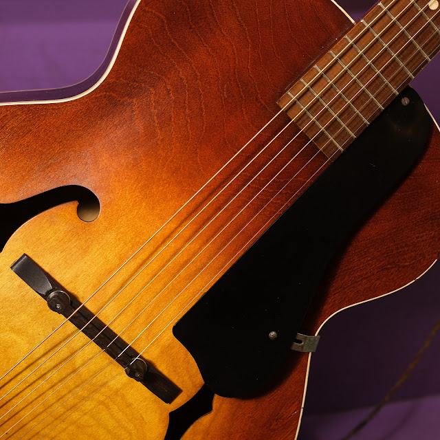 I checked Silvertone World but couldn't find this exact model in their old catalog scans -- just the fancier, also-Harmony-made 708 model. This one's solid birch throughout the body and has a poplar neck and ebonized/stained fretboard. It's got tonebar bracing and, alarmingly, has no cracks or structural failures of any kind. The neck gets a hair of relief when tuned to pitch, though.