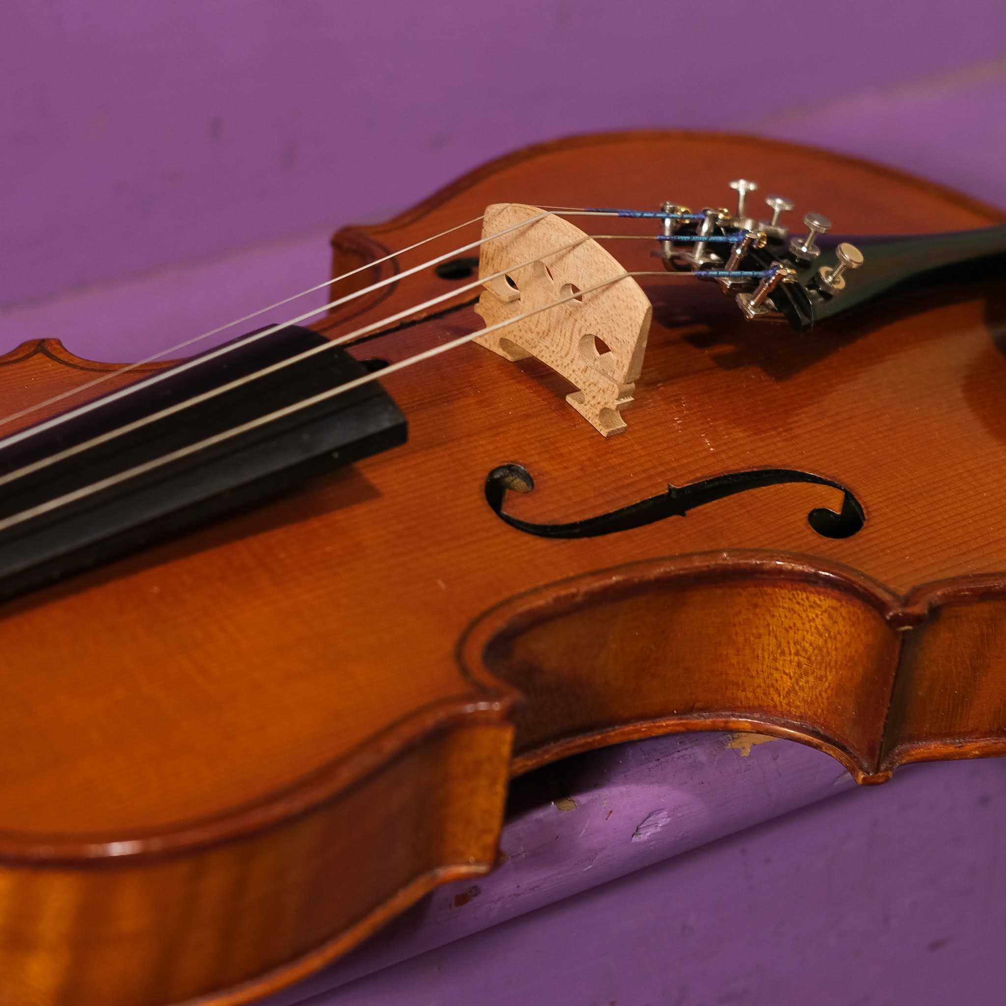 Despite looking like it was built in the '30s, this fiddle is pretty dang clean. The finish looks good save minor usewear here and there and a couple blems and it's well-made and has attractive flamed maple on the back and sides. Its sound is clean and direct and it handles well. I'm also not seeing any cracks.