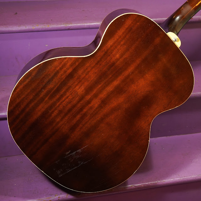 This one was here for customer repair -- though I think the owner might be interested in selling it? -- and it received the usual things old Guilds need -- a neck reset and bridge reglue, among other stuff. Now that it's done-up it plays spot-on and quick. To really make the most out of an acoustic bass guitar, though, you've really got to dial-in a little "relief" into the neck so that if you attack the strings in the middle fret positions you don't get slap from the strings on the frets. It's annoying but it's truth. Bass strings, frets, and super-quick action tend to disagree on acoustic instruments as I've found out from multiple banjo bass and mandobass excursions.