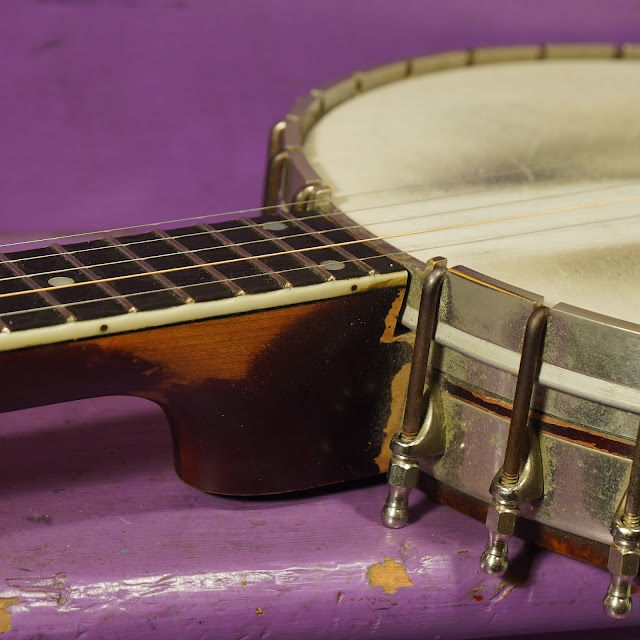 Of course, it also has the absurdly-long neck with its 32 1/8" or so scale length as well, allowing a standard set of banjo strings to tune down to open E below normal G pitch as its "standard" tuning. That makes it a heck of a lot easier to play with guitar and then capo into whatever key you need to pluck along with folksingers and their wants.