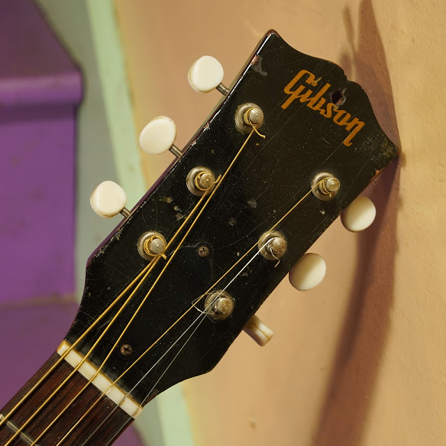 The instrument is original throughout but it does have its share of minor wear and tear to the finish, replacement ('60s Japanese) tuners, and a saddle that's been shaved to only about 1/16" height over the top deck of the bridge. It still plays spot-on, though, even if the intonation is a little flat up at the octave (...because the saddle position is set too far back by about 1/16" or so).