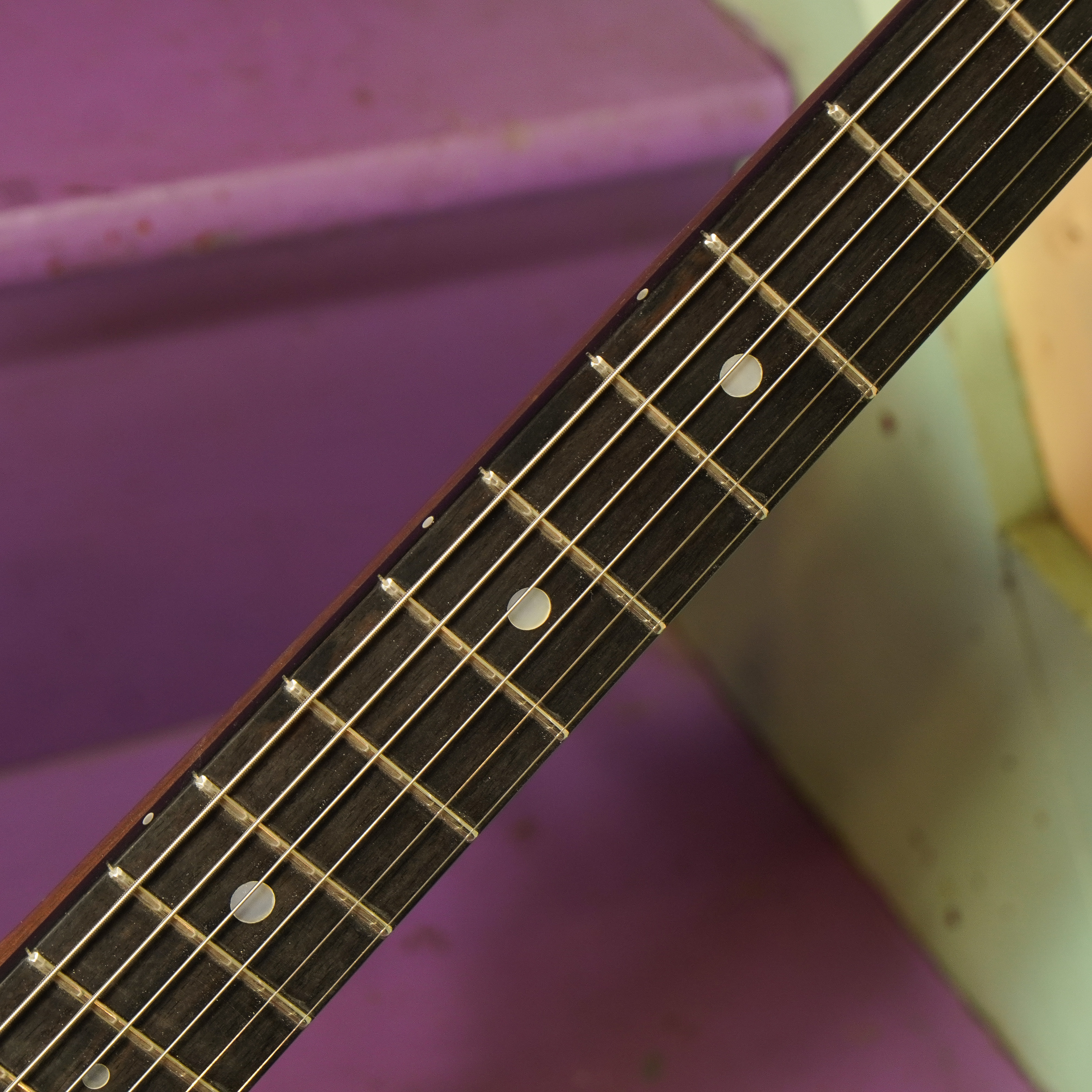 Condition notes: it's in overall good order, now, but shows a ton of pickwear on the top and then random, average usewear/light scratching throughout. The pickguard does not appear to be original but it does look neat on the box. I added a little bit of extra compensation to the bridge so it plays in better tune up the neck, too. There are three repaired hairline cracks on the top. There's also a contact (circle-style) pickup installed internally but while it looks like a K&K, it's not a K&K. It has a more nasal, thinner tone and less rejection to feedback. It's passive and sounds "good enough for government work" if you need to plug this somewhere in a pinch.