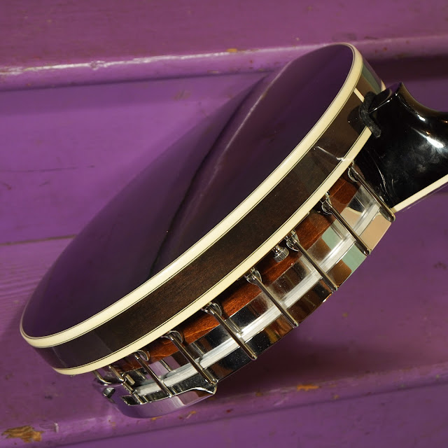 Condition notes: it's essentially new with unplayed frets. There's a ding below the high D tuner on the face of the headstock and perhaps a tiny scratch or scuff here and there in the rest of the finish, but it looks more like something that's been hanging in a shop for 6 months than a 12-year-old banjo.