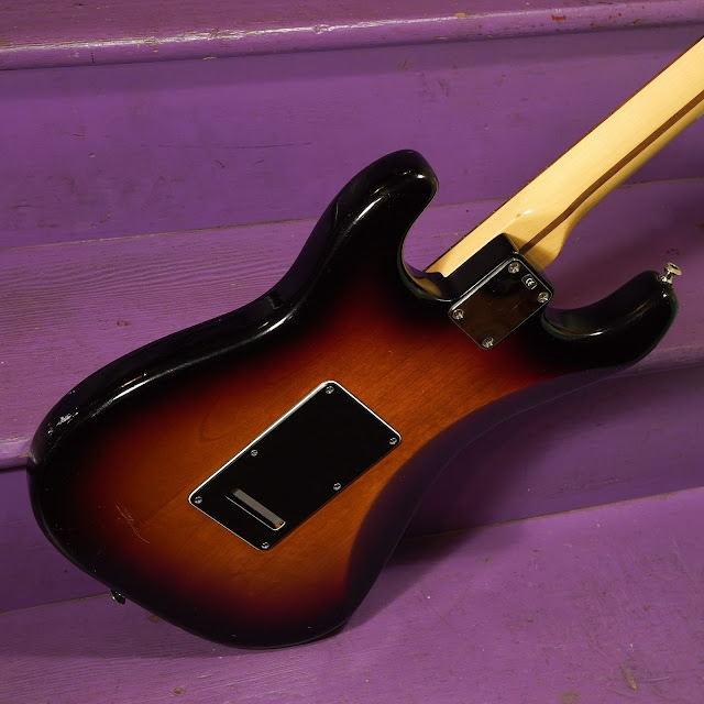 This guy appears to be a modified Highway One Strat and the serial places it at 2007. It's got a thin, nitro finish that has clearly worn-through at the right-arm area (in a delicious way). It's been modified a bit in the wiring and pickup loadout, too. It has two of the original single coil Strat pickups (neck and middle) but there's a Duncan humbucker of some sort at the bridge.