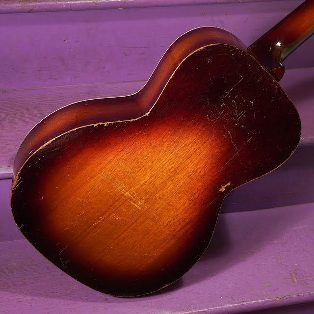 This one has no branding on it but it's clearly the same thing and it's cool as heck. It's between 0 and 00 in size, short-scale like Kay "parlors" from the time at 24 3/8" and has a very-playable, medium-V neck shape with a good radius to the board. I'm not sure if much work was done on this before it got here, but the bridge had been lightly-shaved and a new saddle installed and the tuner buttons were replaced before it got to me.