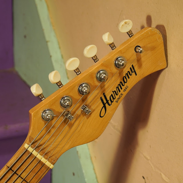 This Chinese-made mini-electric is probably '90s or early '00s and bears the Harmony mark "in name only." This is a Benny Collection instrument and my guy Ancel fretless-ized it for him on Saturday. We fixed the wiring, too, and Benny provided the super-cute little grey knob for it.