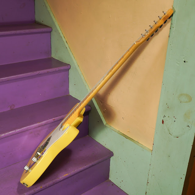 We've just given it a fret level/dress, restring, and setup. It plays bang-on and has a '60s-style neck profile with a steeper radius and 1 5/8" nut width. It's definitely "a good one" and has the classic looks to boot -- maple on white on yellowed-blonde. FujiGen definitely nailed it on the classic late-'60s Fender feel and it feels "like home" to any of us used to that neck profile and vibe.