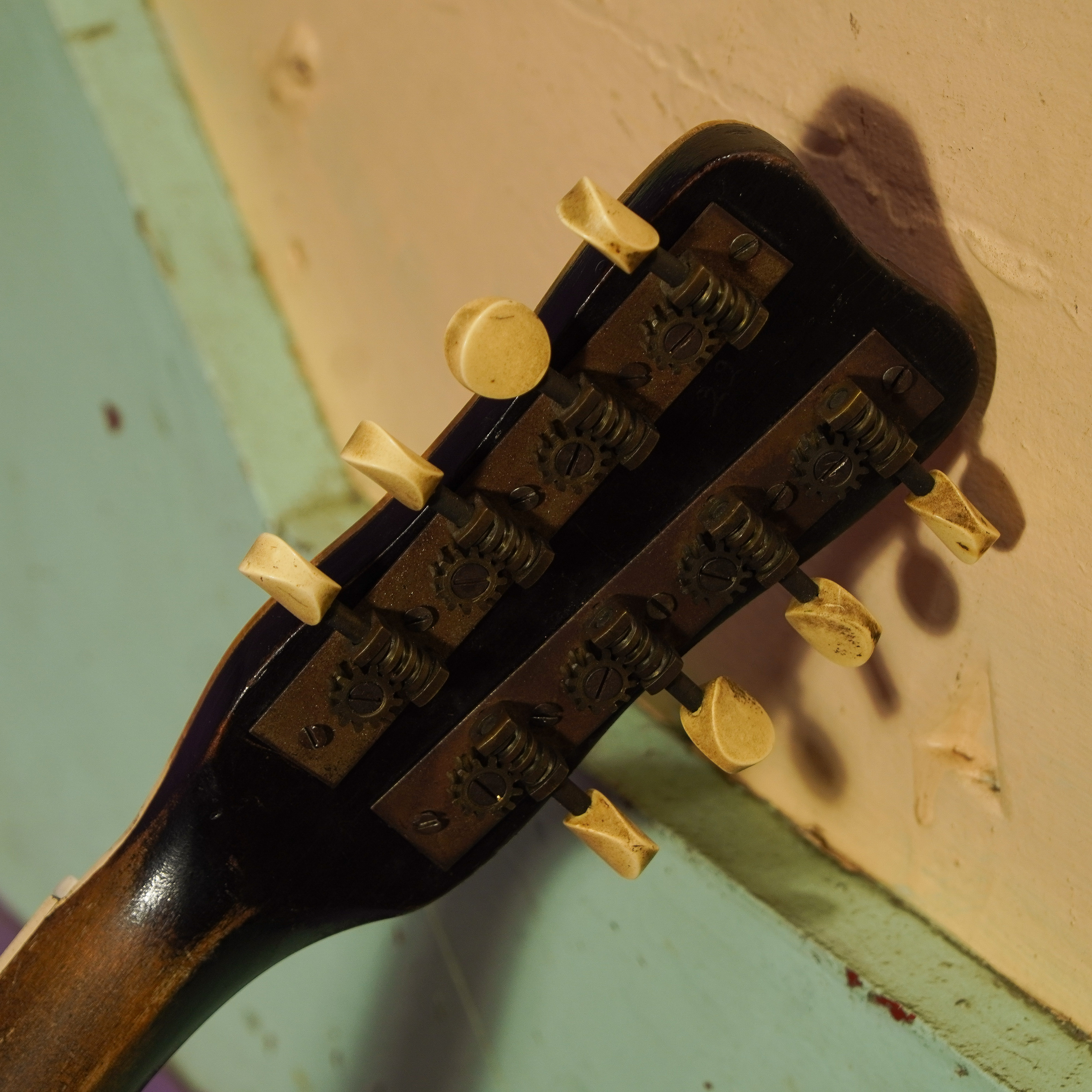 This is a simple, no-frills, birch-bodied, flatback mandolin from probably around 1915 or so. It's probably a Regal make but, failing that, the only other maker doing similar binding and design work at the time was Schmidt so I suppose it could be one of theirs, too. The neck cut is similar to period Schmidt mandolins, too. Most of the other Burdwise instruments I've seen have been Regal-made for the firm, though.