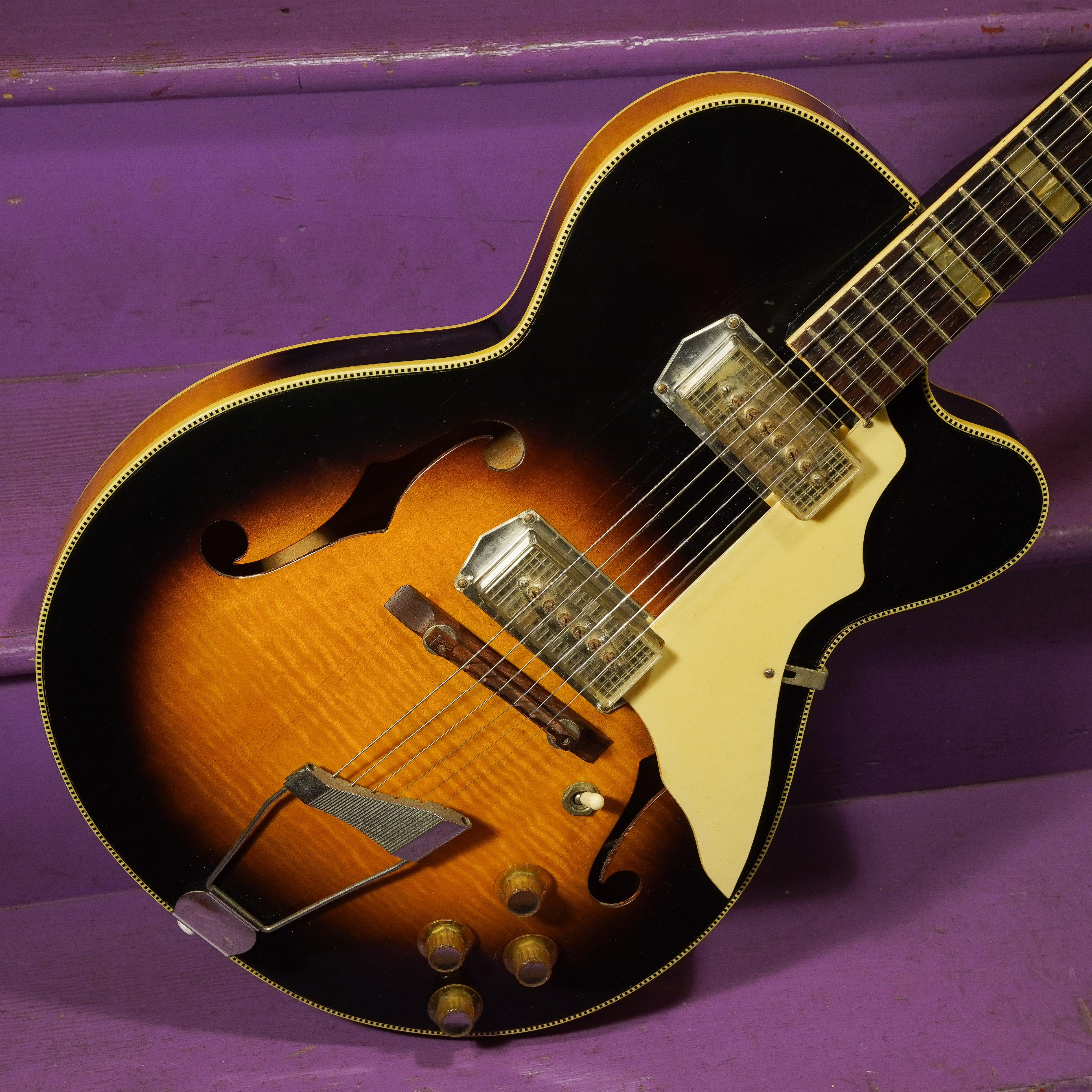 It's rare that a nice old Kay comes in the shop as clean as this one. Everything is original (save strap buttons) and it only needed a mild wipe-down to clean-up. I gave it a "glorified setup" and it's now playing quick and, due to those excellent Kleenex Box pickups, has a mids-forward, pushy, grumbly blues tone that hits the spot every time. Like a lot of these, the center position on the 3-way appears to be out of phase and so you get "sauce" in the neck or bridge positions and a perfect "sucked chord-strum" sound in the middle that lets you ape an acoustic, in a way.
