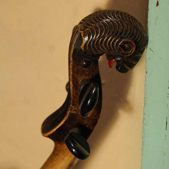 Let me just say -- this is a stunner in the looks department. It has a beautifully-carved lion's head in place of the scroll -- complete with a red tongue -- and rope binding at every edge of the body. The fingerboard looks like cherry (but may be maple) and provides a pretty contrast with the rustic-looking finish all over the body.