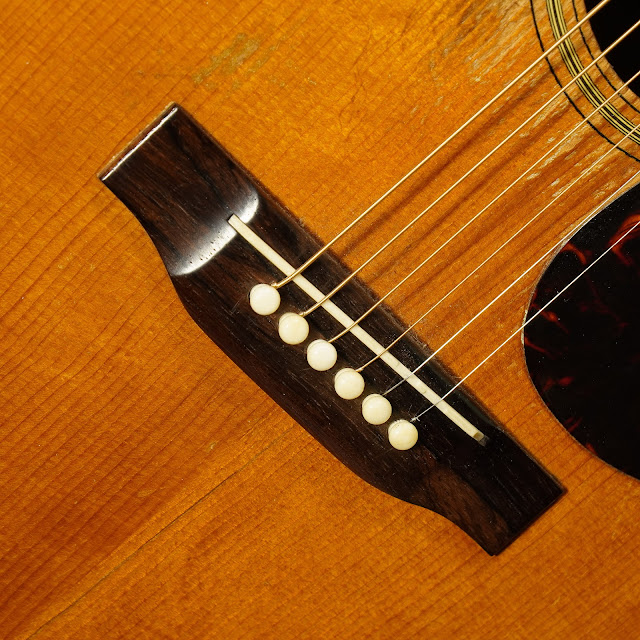 This is an interesting guitar -- it's a '60s 000-18 that sounds remarkably like an early-'50s model. It's got a woody, warm, full sound that's not too scooped in the mids and has a lot of volume. Some work had been done on it in the recent past and because of that it has a non-original, pretty -- but not-quite-period -- through-saddle bridge. It's quite a nice bridge, however, with great-looking rosewood and an authentic cut.