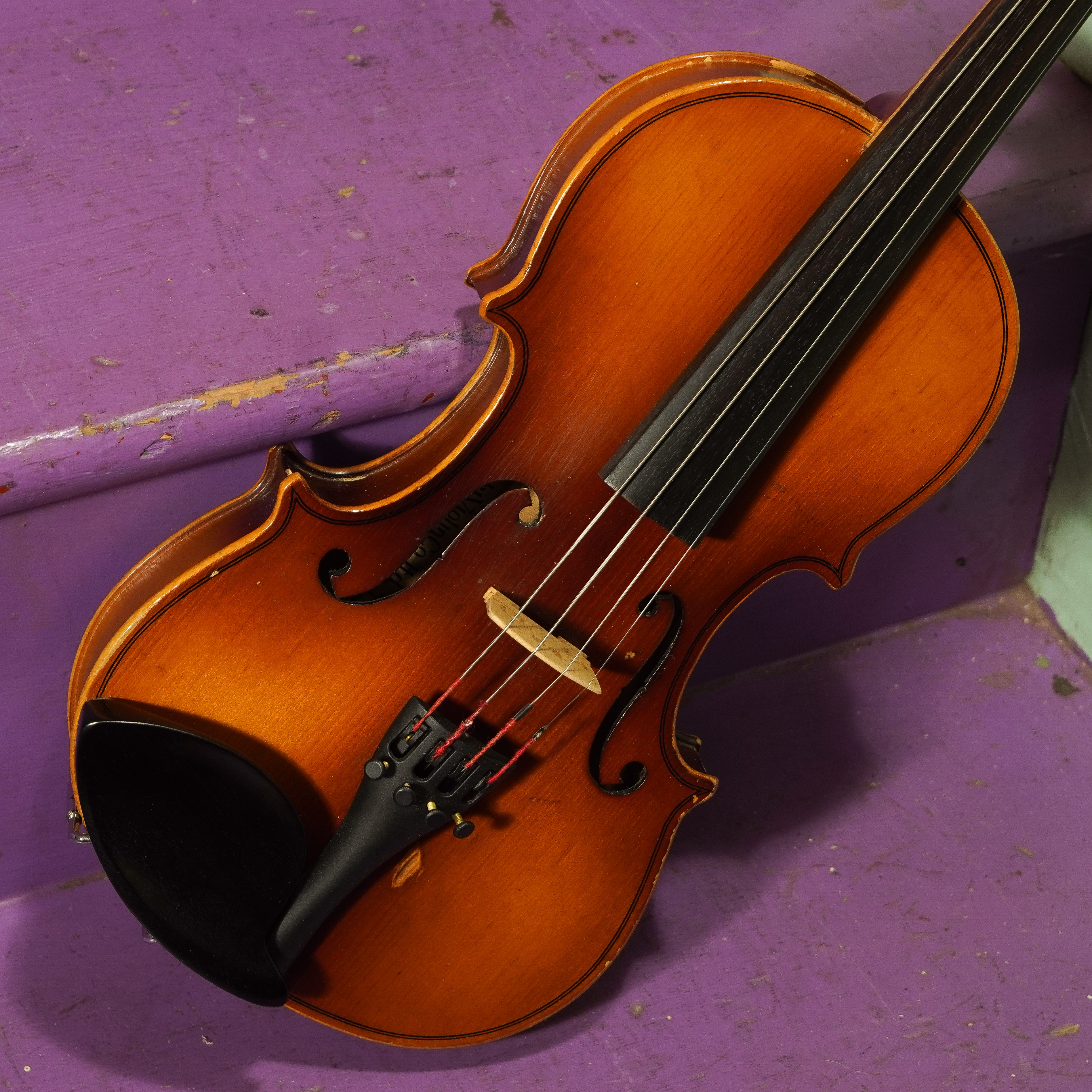 A local customer asked if we could get a 1/4 size and 1/2 size fiddle done for some kids for the holidays. This is the 1/2 size and it's a Japan-made, Suzuki, Strad-copy fiddle that has the same solid, clean, good tone that I expect from most Suzuki instruments. They also have solid build quality.