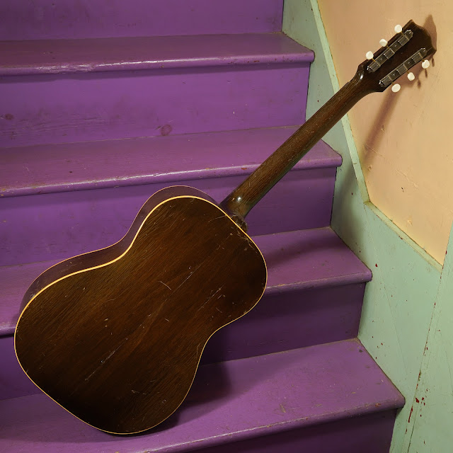 Condition notes: It's entirely original save the saddle and pins. There are a bunch of scratches on the lower-bout-top and, really, the rest of the body as well. The finish has weather-checked throughout and there are areas where it's flaked-off as it's aged. The saddle is on the low side as the top domed-up a bit after repairs last year -- ah, ladder-bracing! Still, the work is all done and it's playing great.