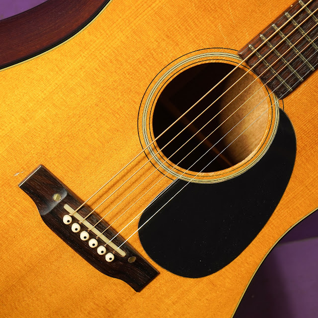 Condition notes: It has some stuff going on, of course. First-off, we had to expand the saddle slot to be able to get a wide-enough saddle in there to get proper compensation (Martin was keen on installing bridges 1/16" off target in the '60s and '70s) There are also the aforementioned dots in the bridge wings. There's a strap button added to the side near the heel. The finish, overall, has weather-checking here and there throughout. There's evidence of an old neck joint repair at the heel with some glue seep inside around the neckblock and overspray of the finish all around the joint area on the outside. It's clearcoat but has "cracked" in longish, curvy stuff on the sides directly butting the heel and on the back. The top of the guitar has one repaired hairline crack on the lower bout but the back has several old repairs to various hairline cracks, mostly clustered south of the heel area and then one shorter repaired crack near the endblock at the back. There's an old "dimpled-in" crack repair next to the endpin. The bridge pins and endpin are later replacements.