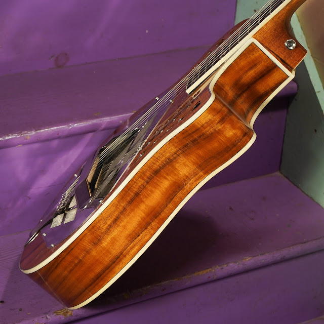 Overview: There have been a number of Royall resonator guitars in this year and I can see why -- at their price points they are pretty great instruments, though all of them have needed some heavy-handed work on frets and setup to get them playing spot-on. Once dialed-in, though, they become killer instruments. This is the most interesting variation of the ones so far and has ply koa through the body, a cutaway, tricone cone configuration, and a "vented" upper bout soundhole design that recalls National's own design -- but done in wood. I like!
